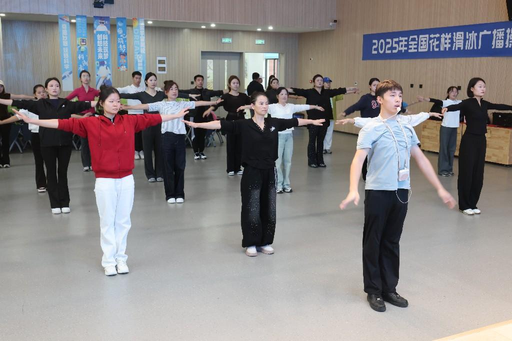 作为花样滑冰普及化的创新载体,花样滑冰广播操融合项目技术动作与广播操组织形式,有效降低参与门槛,成为推动“北冰南展西扩东进”战略落地、深化体教产融合的重要抓手。当日,根据中国花样滑冰协会的委派,沈阳体育学院花样滑冰运动员、中国花样滑冰协会广播操特聘教练员刘瑞松围绕广播操动作细节、教学方法、音乐节奏等关键环节,对参训的教练员展开了系统培训和指导。