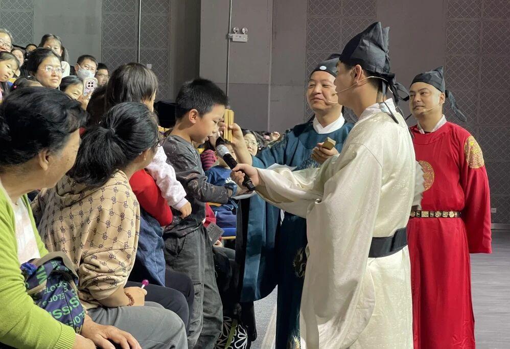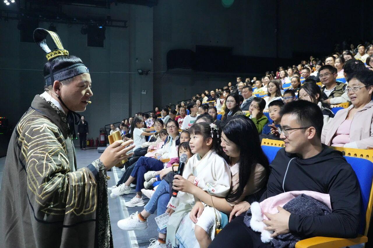 下午的《荆轲刺秦》则带领观众穿越至战国纷争时代。演员们凭借独特的语言技巧与趣味互动,将课本中严肃的历史故事变得生动易懂——秦王的雄才、太子丹的忧思、荆轲“壮士一去兮不复还”的壮烈,都通过演出让课本里的名字变成了有血有肉的人物。散场后,孩子们围着家长叽叽喳喳讨论:“荆轲到底是好人还是坏人?”“秦王为什么要和太子丹反目?”一位家长感慨道:“原本内向的孩子,今天主动举手登上舞台,下台时还一脸骄傲。这样的演出不仅让孩子爱上课本故事,更给了他们成长的舞台。”