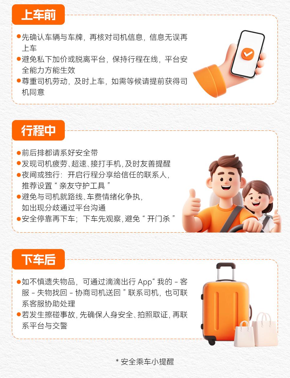 同时,假期出行容易因赶路、堵车、费用等影响心情,恳请司乘双方相互尊重、文明沟通。请司机师傅耐心对待每一位乘客,避免急躁、超速、疲劳驾驶等。也请乘客尊重司机的劳动,协助保持车内整洁,不携带危险物品,不超员乘坐,及时上车,安全下车。