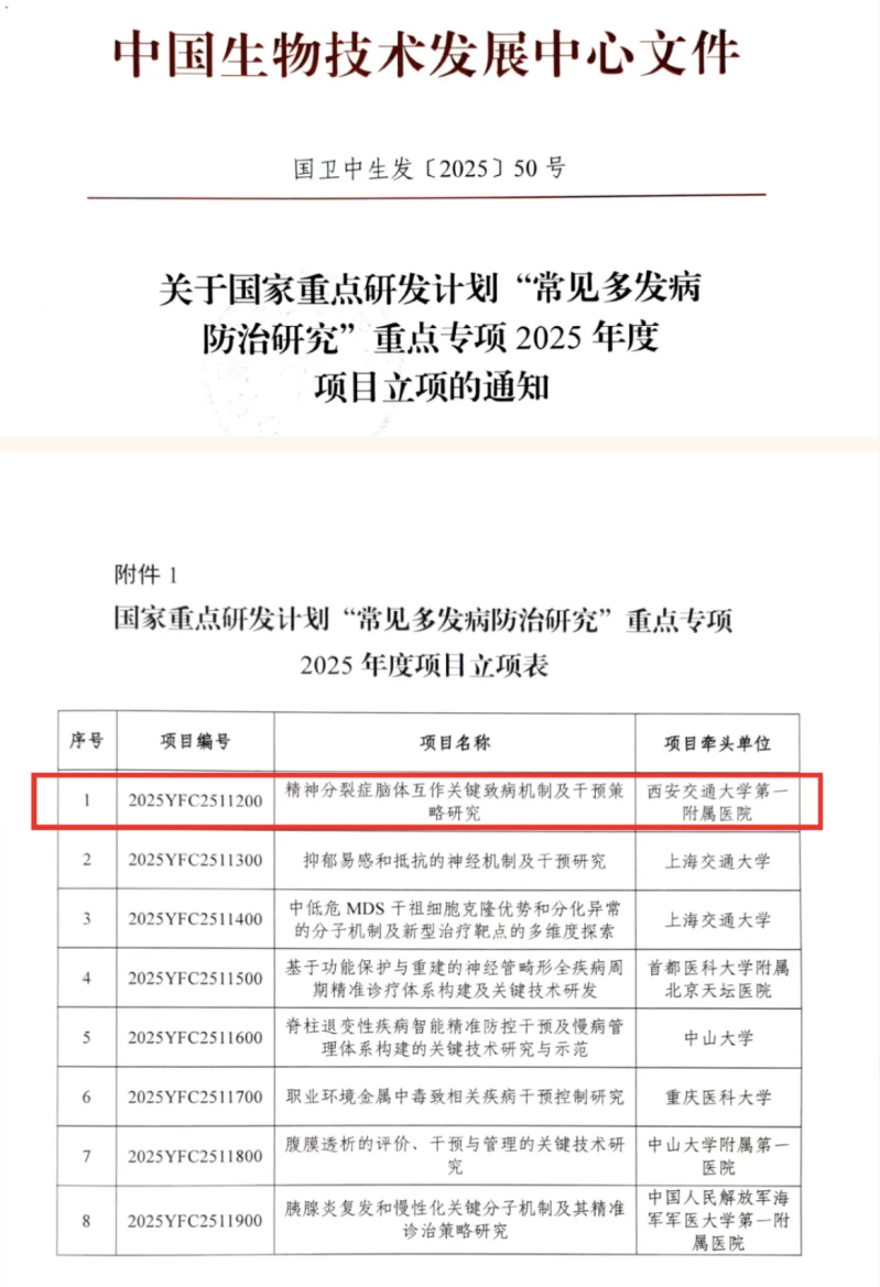 三秦都市报-三秦网讯(记者 阮班慧)近日,科技部正式公布了2025年度国家重点研发计划“常见多发病防治研究”重点专项立项名单,由西安交大一附院精神心理卫生科马现仓教授担任项目负责人的“精神分裂症脑体互作关键致病机制及干预策略研究”项目成功获批。