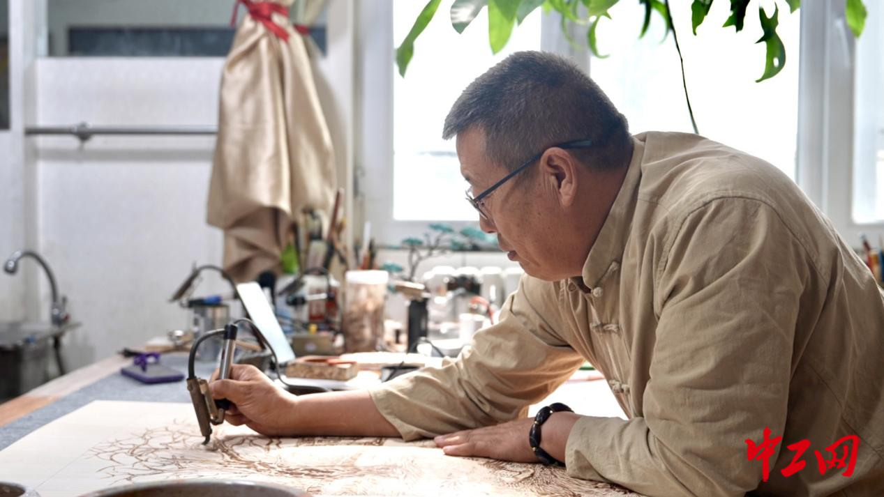 电烙笔笔尖轻触椴木板,“嗞嗞”声随即响起,杨新平全神贯注地操控着笔,木板上,胡杨的轮廓逐渐被勾勒出来。谈及与画结缘,他抬头一笑,一口浓重的“兵普”扑面而来:“从小在兵团长大,后来偶然见到民间老艺人用火钩子画画,一下就入了迷。说到底,还是心里装着这片土地,想把兵团的故事画出来。”