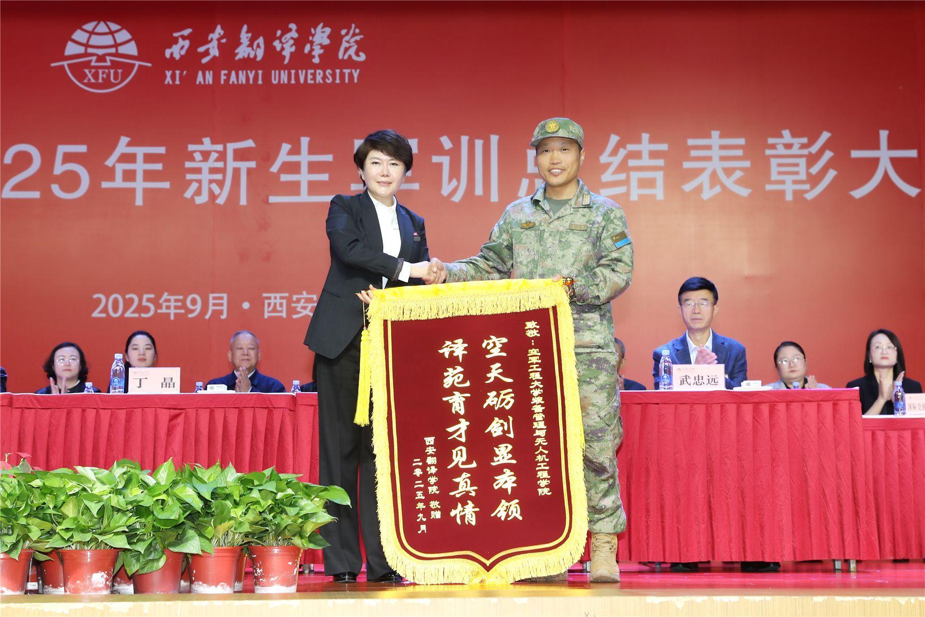 丁晶代表西安翻译学院向中国人民解放军空军工程大学赠送锦旗,对他们在此次新生军训工作中给予的专业指导与大力支持表示感谢。