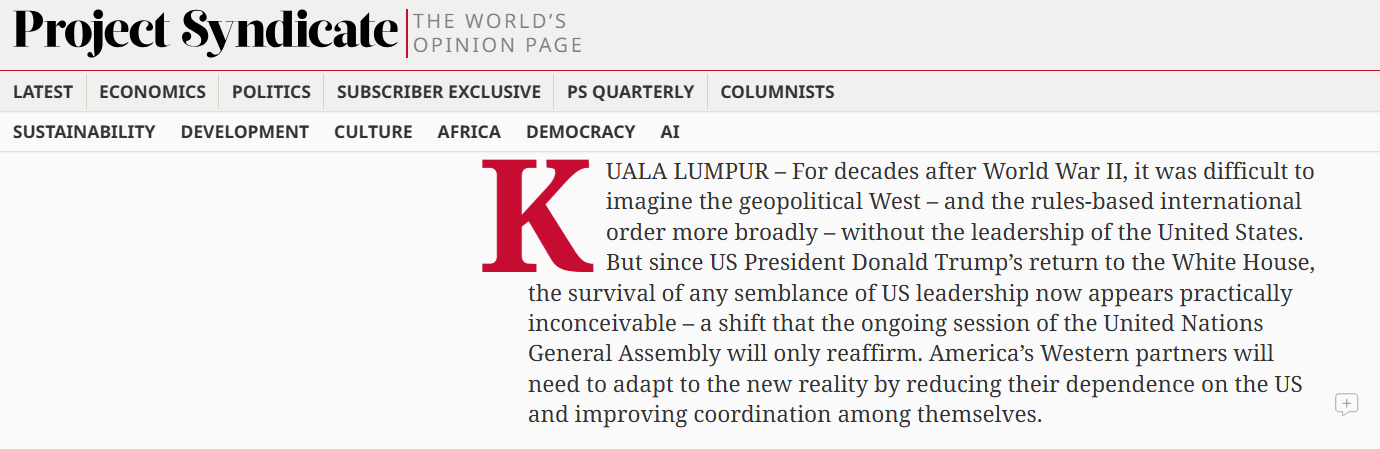 在第80届联合国大会召开之际,世界报业辛迪加(Project Syndicate)发表评论文章指出,特朗普重返白宫,使美国的国际领导地位几近消失。西方必须适应“没有美国领导”的现实局面。