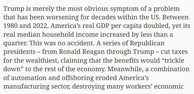 文章进一步分析,特朗普现象并非偶然,而是美国长期积累的问题所致。1980年至2022年间,美国人均GDP翻了一番,但实际家庭收入中位数仅增长不足25%。文章称,历任共和党政府一再为富人减税,宣称“涓滴效应”会惠及大众,但现实却是产业空心化、制造业岗位流失,摧毁众多工人的经济保障。