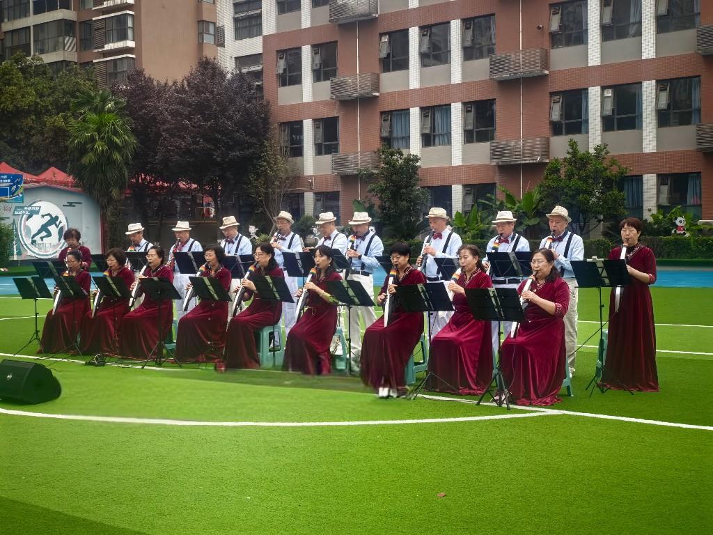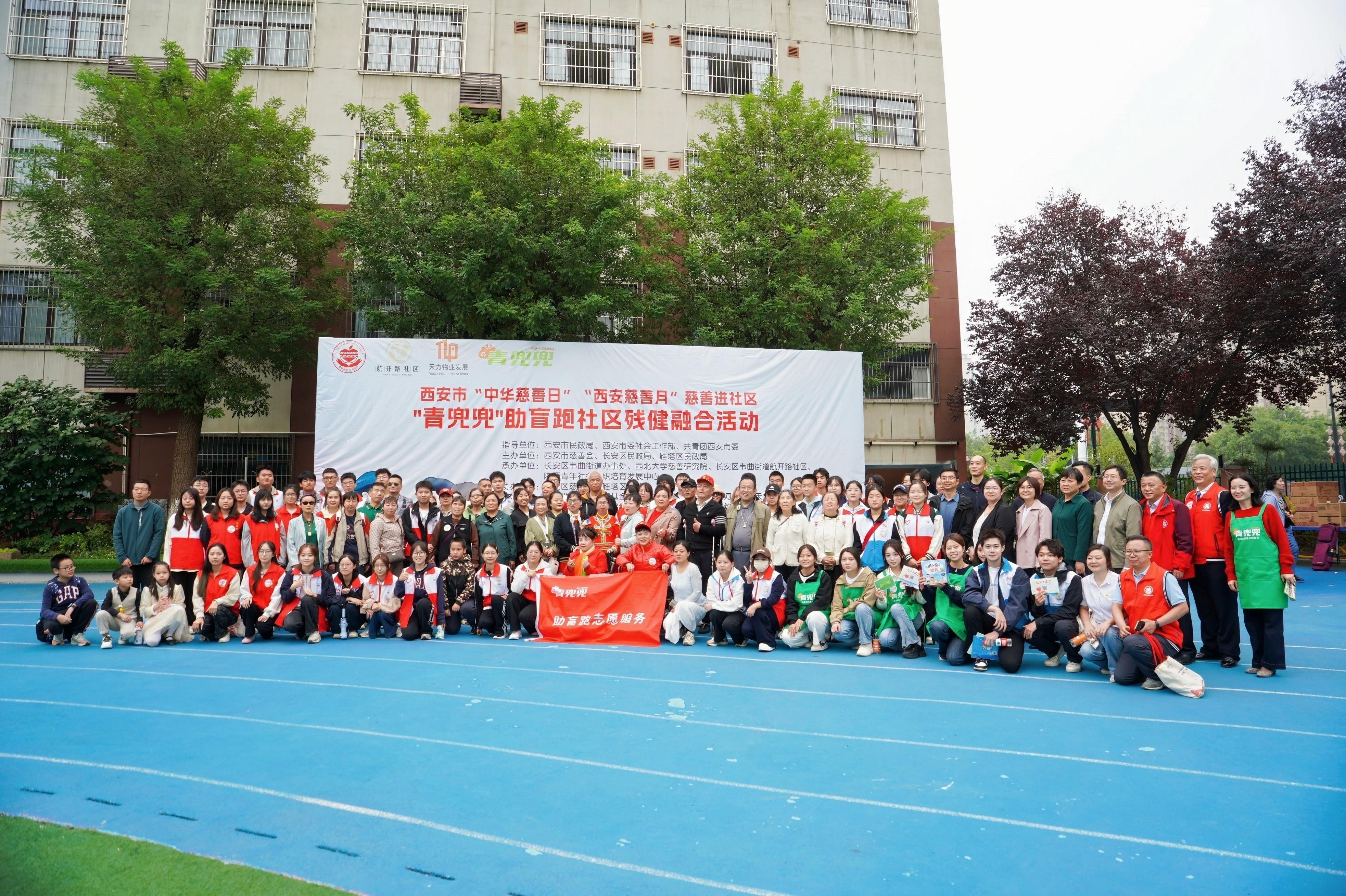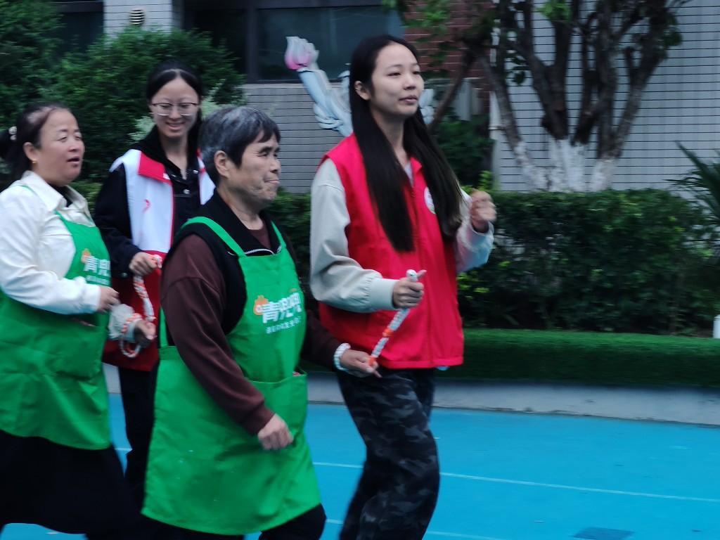 社区文艺志愿服务队自编自演《我爱你中国》快闪,观众随歌舞动;跑道上“助盲跑”牵手开跑后,视障跑者与社区居民手系引导绳并肩奔跑,呐喊声与鼓掌声交织成残健融合的动感画面,充分展现了社区慈善的包容性与人文温度。