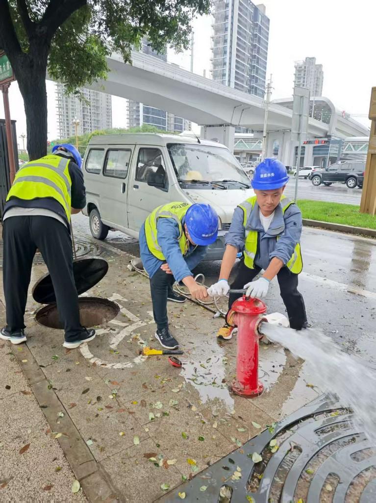 楚柯(右1)与同事在桑军大道上用消火栓冲洗主管道