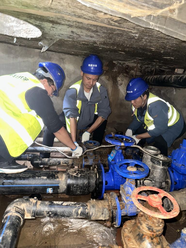 楚柯(左2)与同事在小区检修泥坑抢修 力保供水