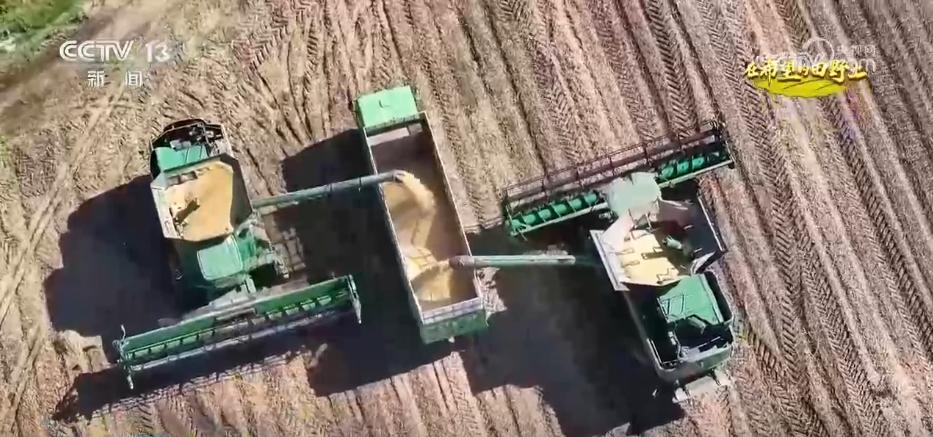 在北大荒集团鹤山农场的大豆田里,先进的大型联合收获机正在高效作业,收割、脱粒、秸秆粉碎还田全靠它,满载金黄豆粒的运输车辆在田间穿行。