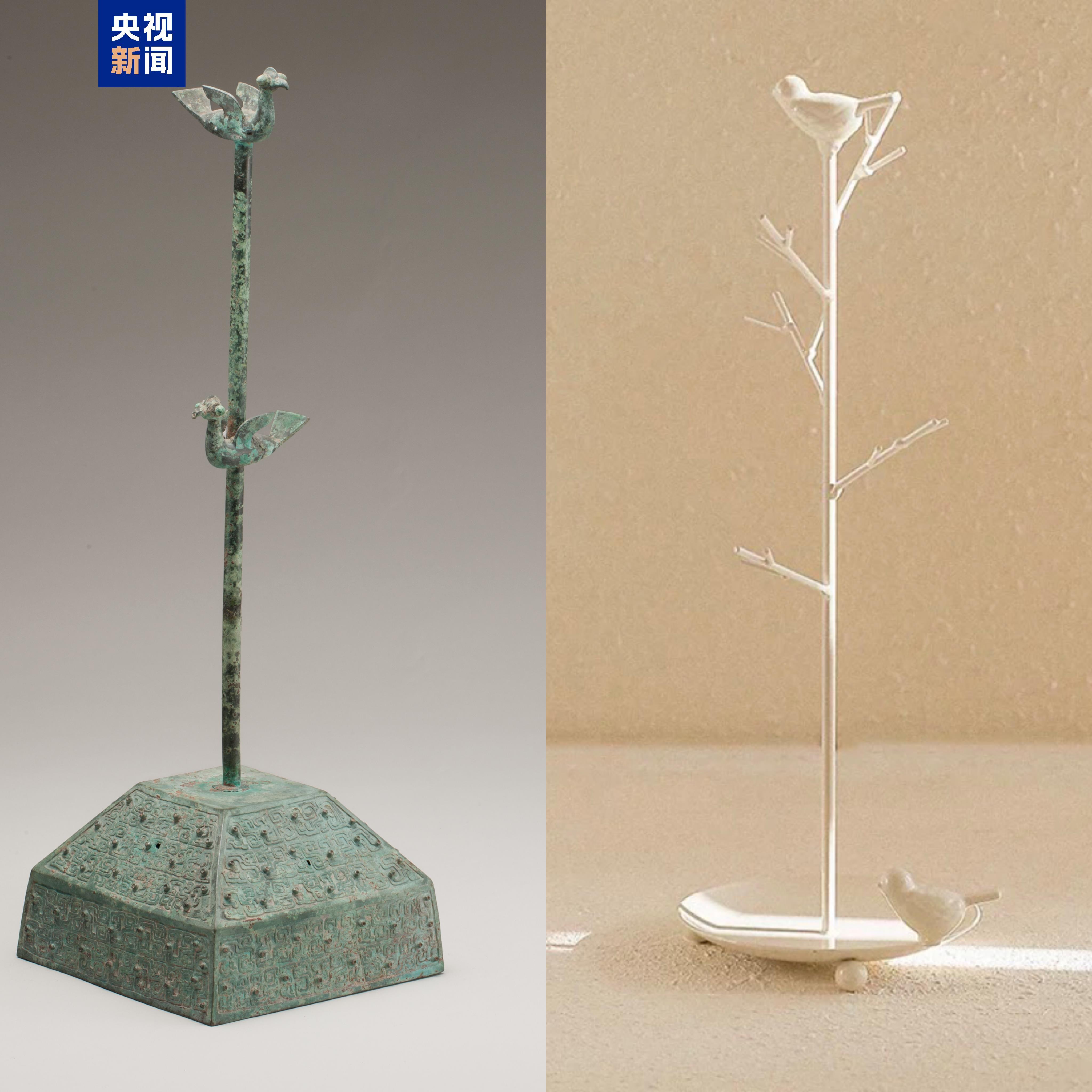 △铜鸟柱(左)与现代饰品架(右)对比图