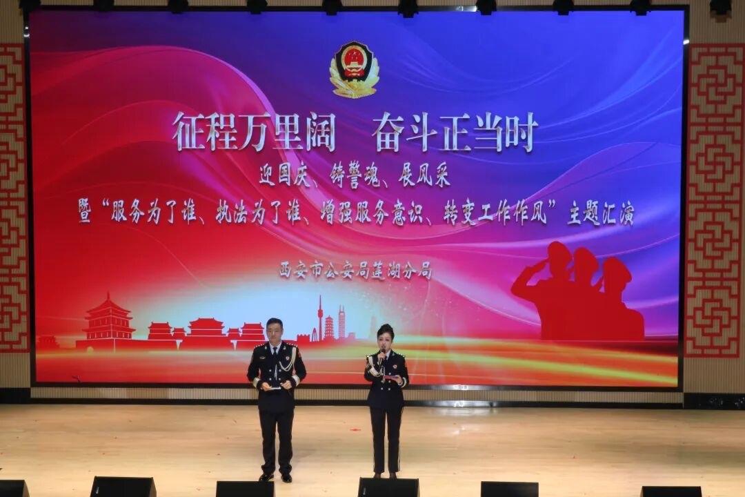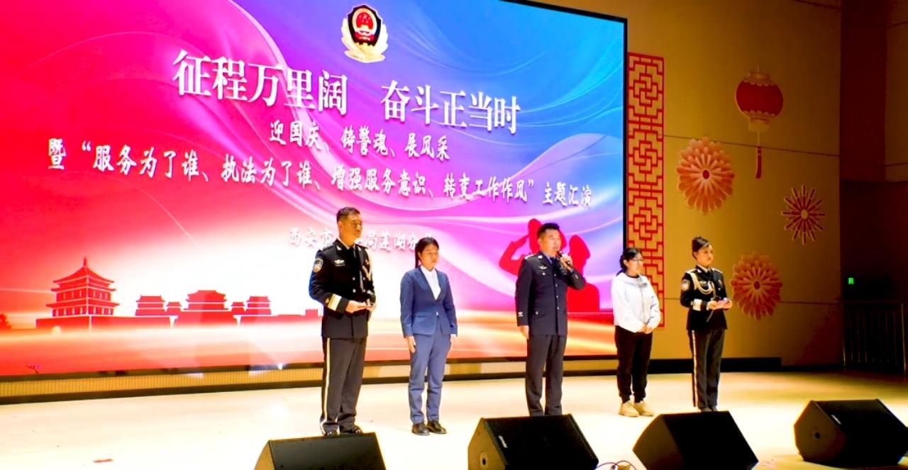 三秦都市报-三秦网讯(记者 陶颖)为庆祝中华人民共和国成立76周年,深入诠释“服务为了谁、执法为了谁”的核心价值,持续增强服务意识、转变工作作风,9月28日下午,西安市公安局莲湖分局举办“迎国庆、铸警魂、展风采”暨“服务为了谁、执法为了谁、增强服务意识、转变工作作风”主题汇演。