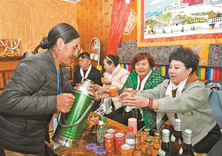 山南市乃东区扎西曲登社区的112号民宿主人刚组为游客们倒上热乎的酥油茶。记者 旦增兰泽 洛桑 唐斌 摄
