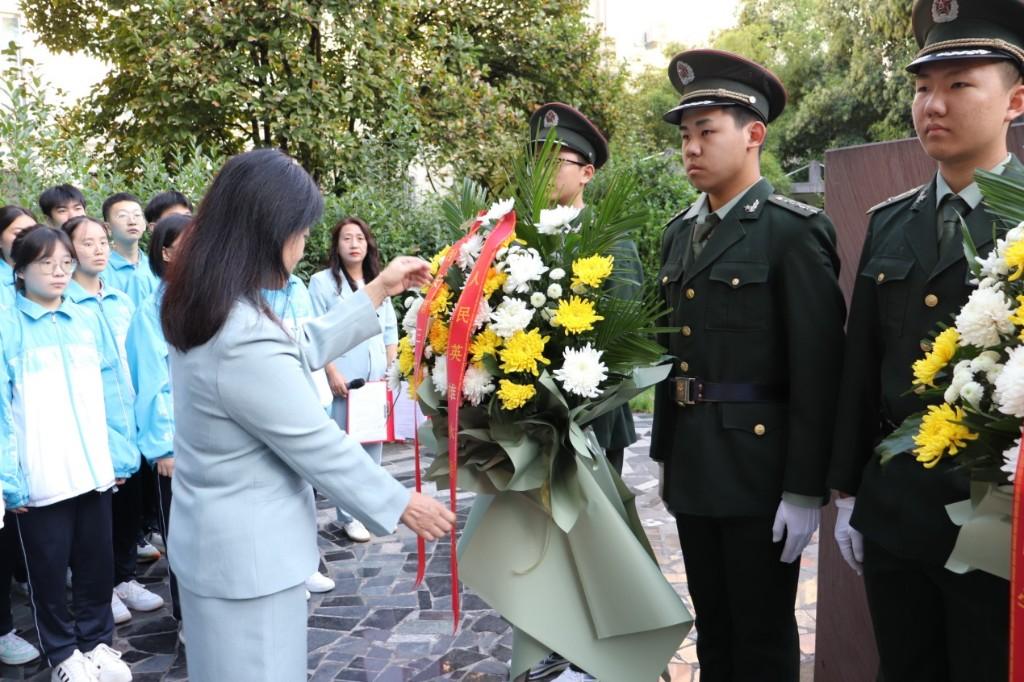 学生代表向孙蔚如将军雕像敬献花篮,学校负责人整理花篮缎带,表达对将军的深切缅怀。高二二班刘铭一同学作为团员代表发言,表示要继承先烈遗志,勤奋学习,践行“请党放心,强国有我”的誓言。