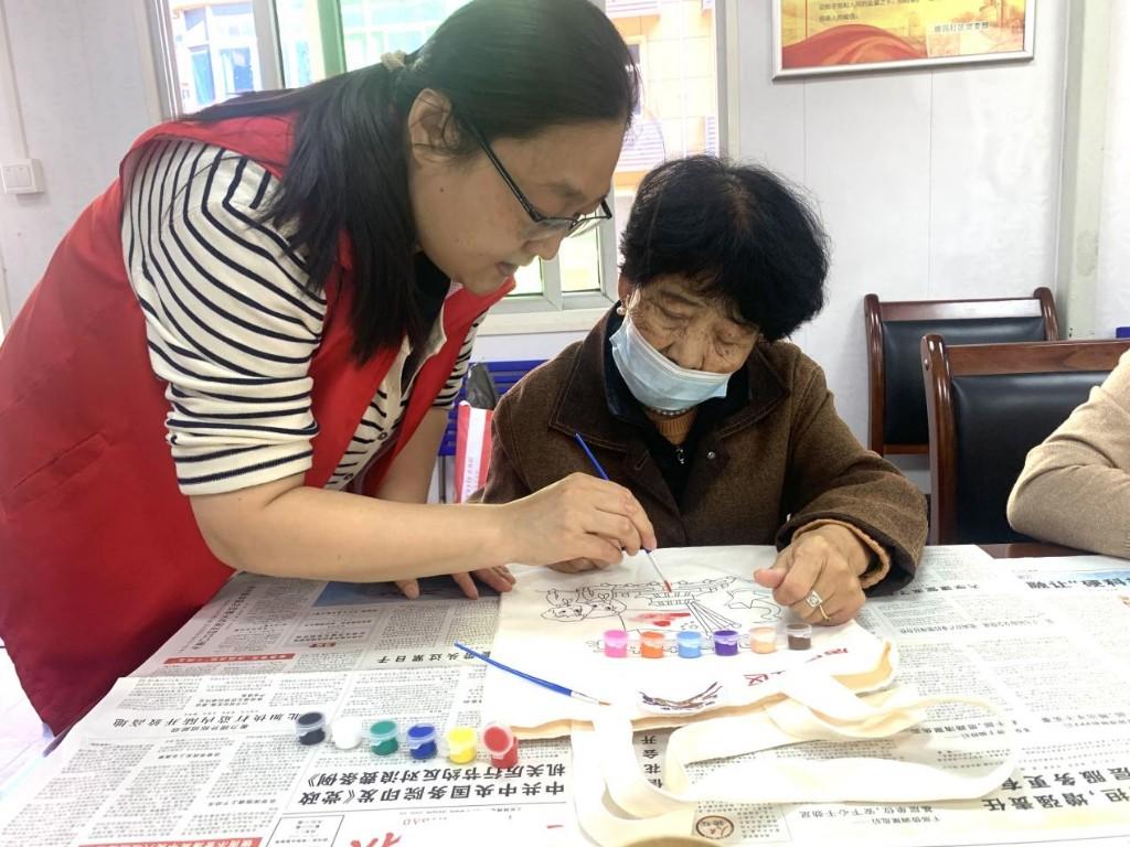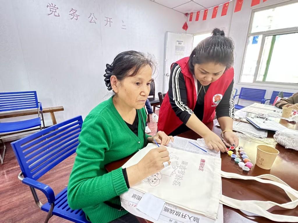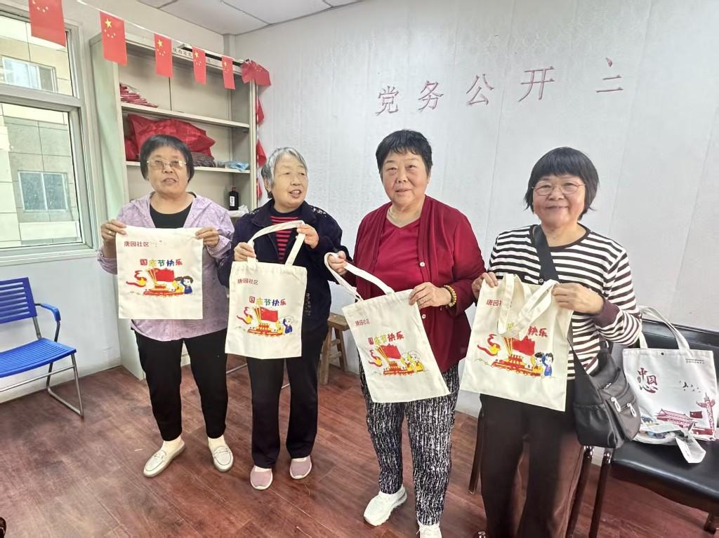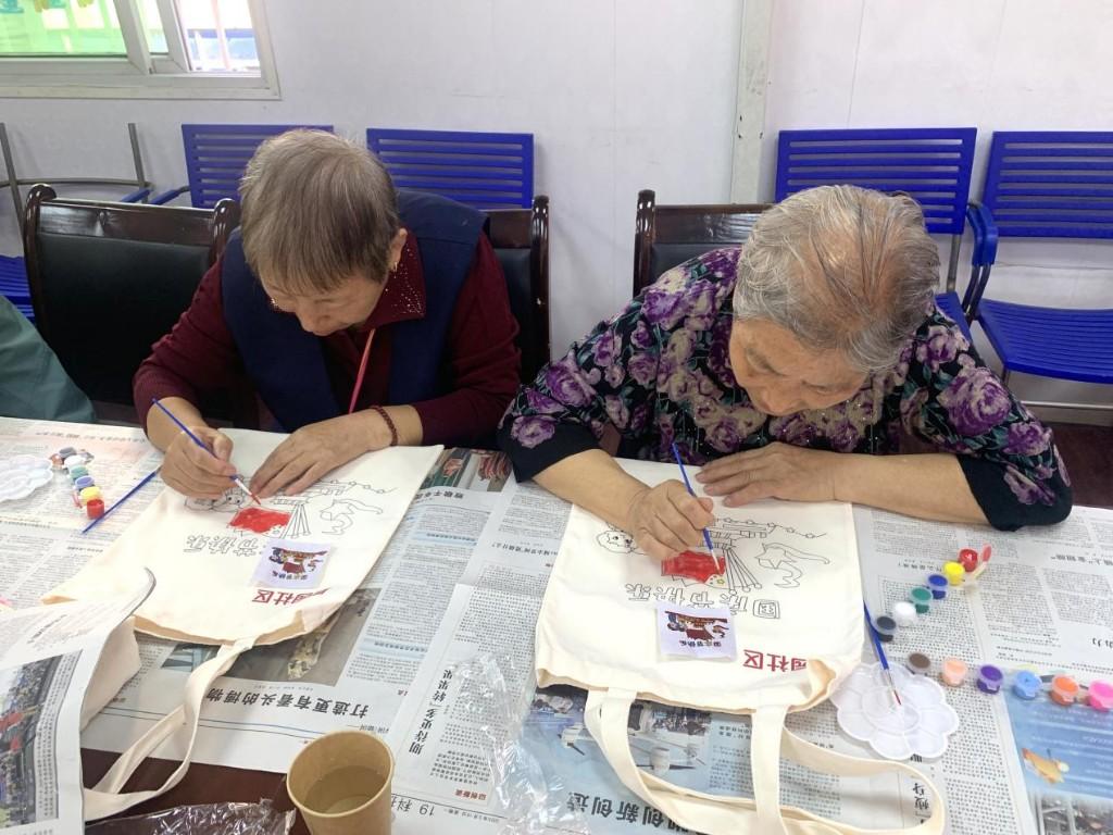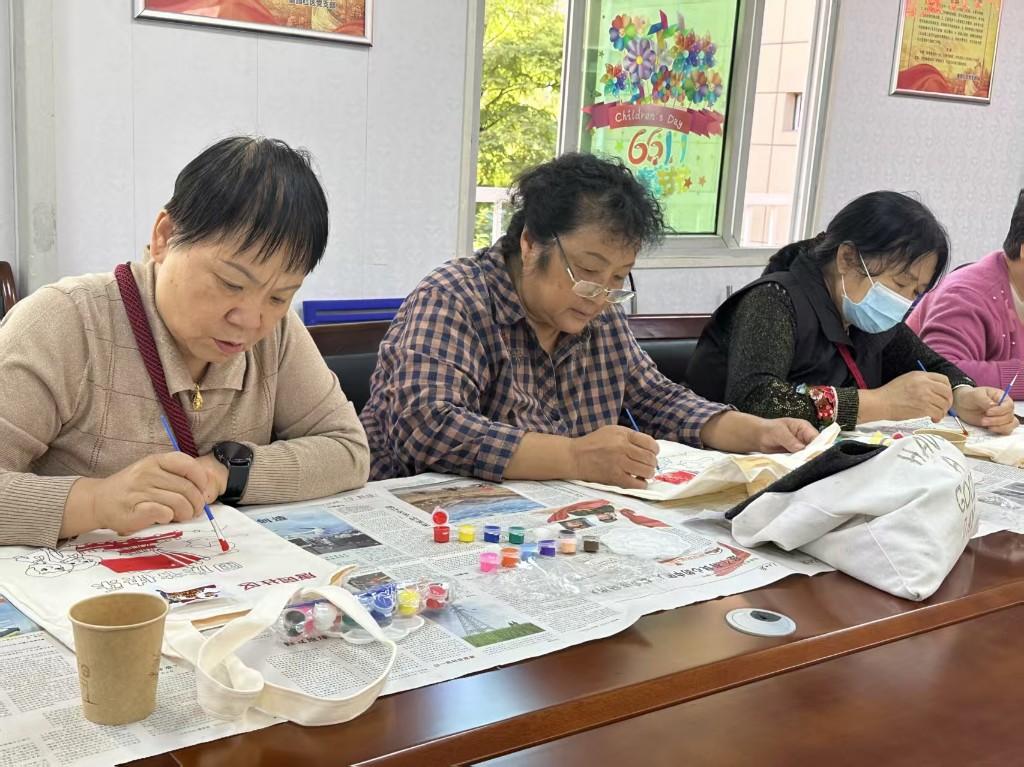 活动伊始,手工老师为居民们详细讲解了手绘帆布包所需的材料、制作步骤、绘画技巧及注意事项。在志愿者的协助下,社区居民纷纷拿起画笔,蘸上五彩斑斓的颜料,在素色的帆布包上勾勒填充,尽情释放创意与想象。每一笔勾勒,每一片填色,都凝聚着居民们对祖国的深情厚谊,涌动着一股炽热而真挚的爱国情怀。