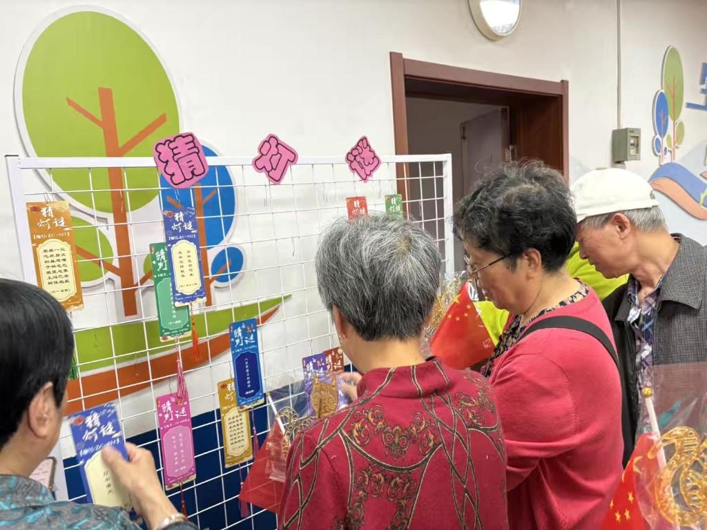 猜灯谜的区域人头攒动,大家在挂满彩色谜题的展架前驻足讨论,谜面内容涵盖中秋习俗、国庆知识等,居民猜对灯谜即可获得印章,集满印章或单次获胜者可到兑换处领取小奖品,增加活动互动性与趣味性。