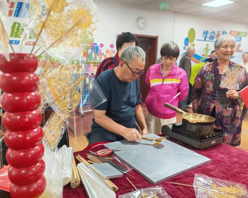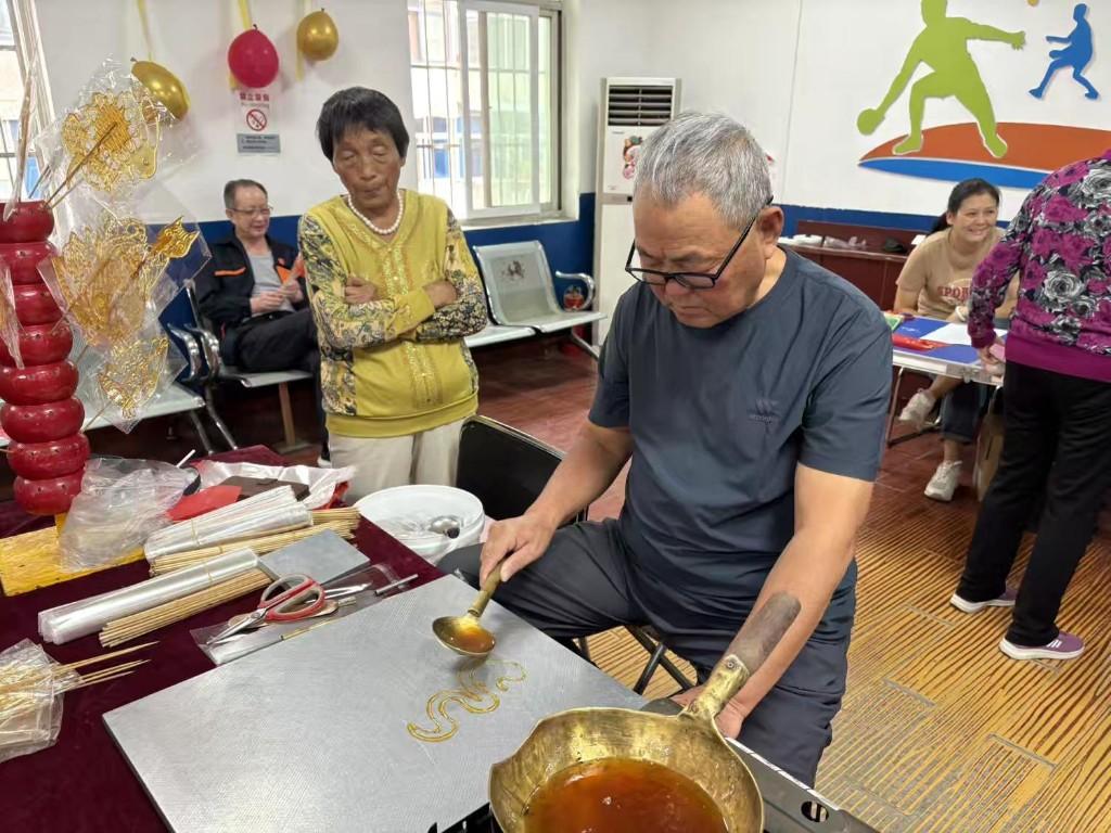 非遗糖画代表性传承人现场表演糖画制作技艺,用融化的糖汁绘制生肖、国庆元素等图案,居民们既可观赏、学习,还能免费领取糖画作品。