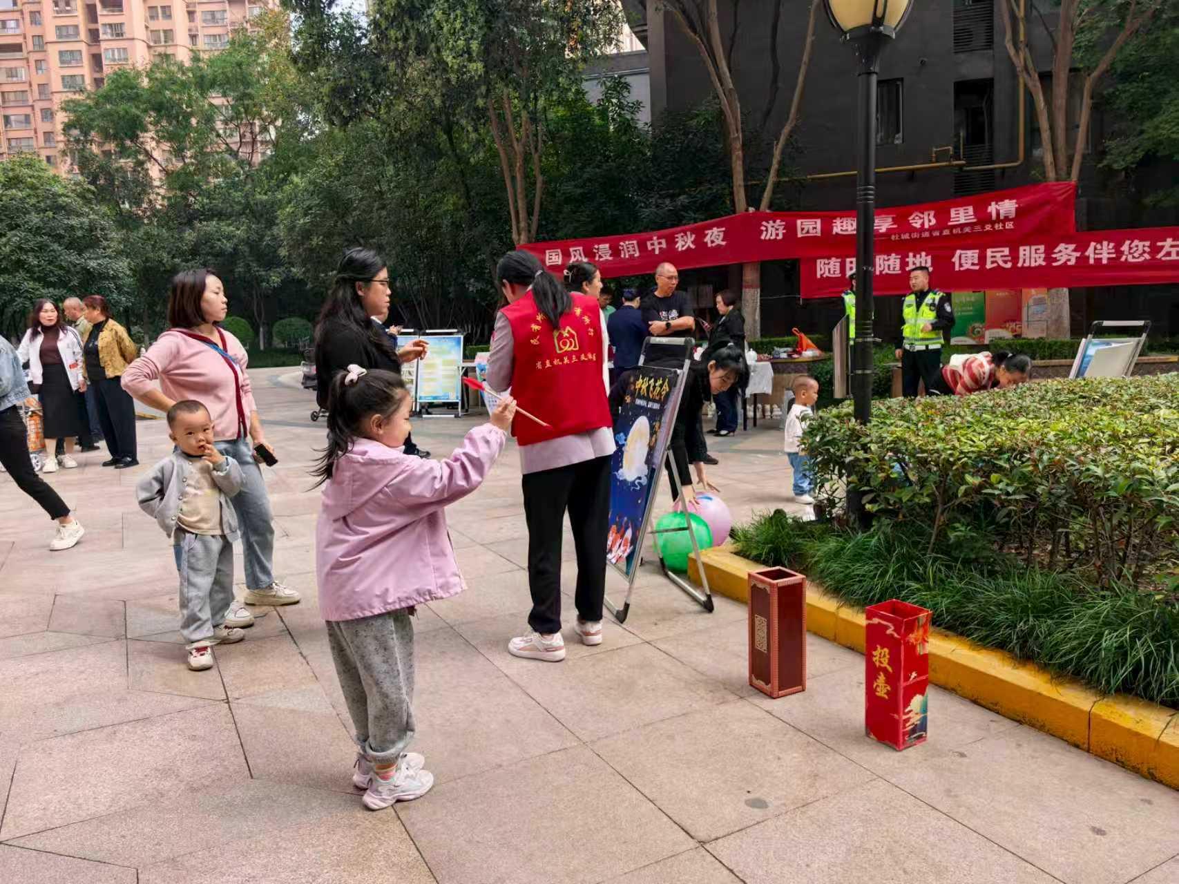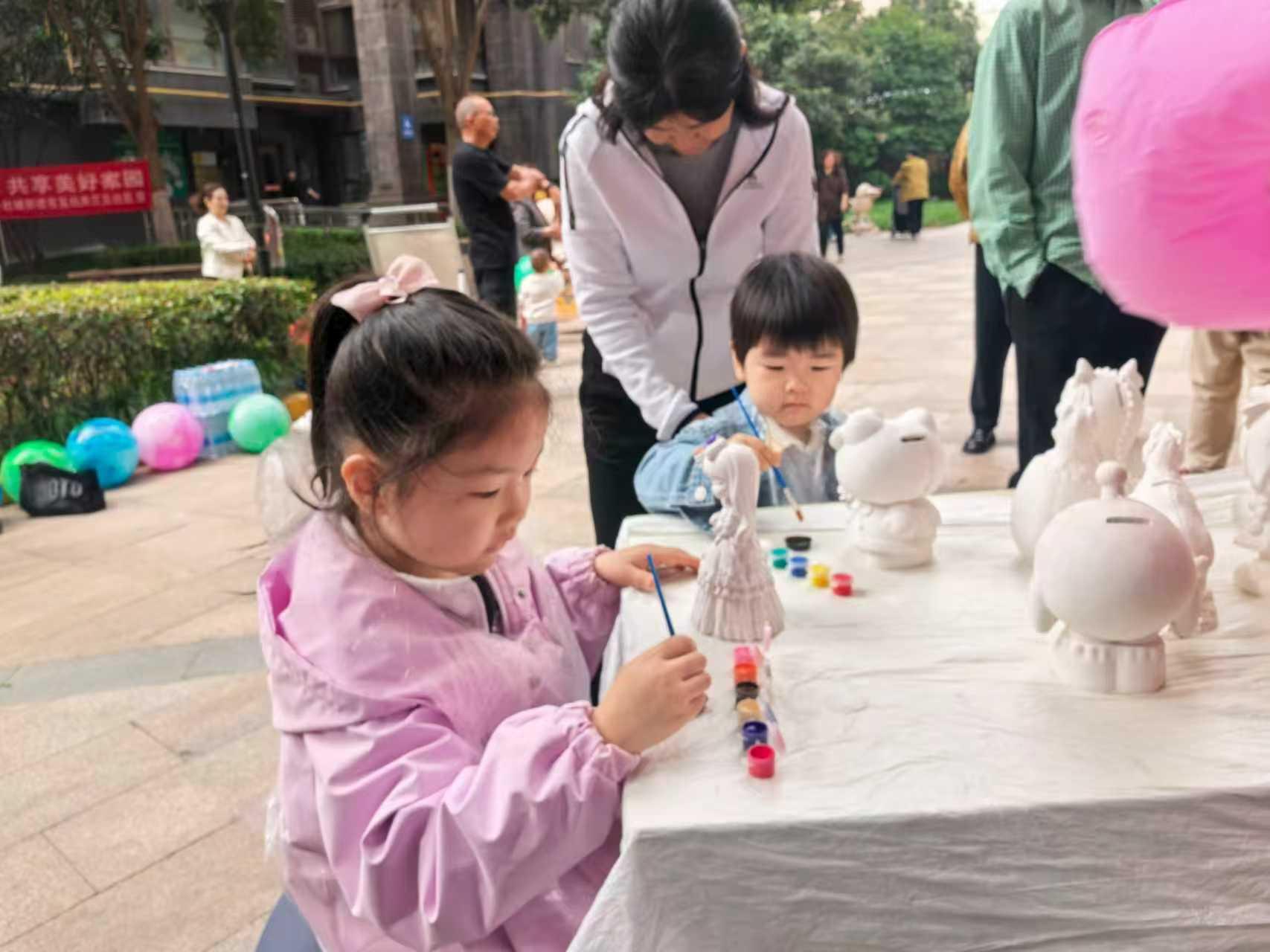 在涂石膏娃娃 DIY 的长桌前,孩子们趴在桌上,用画笔将洁白的石膏娃娃涂成憨态可掬的玉兔、圆圆满满的月亮。“心愿桶”旁更是涌动着脉脉温情,居民们拿起笔,写下对中秋的期盼、对社区的祝福。而“企鹅漫步”“猴子捞月”等趣味游戏区,更是充满了欢声笑语。