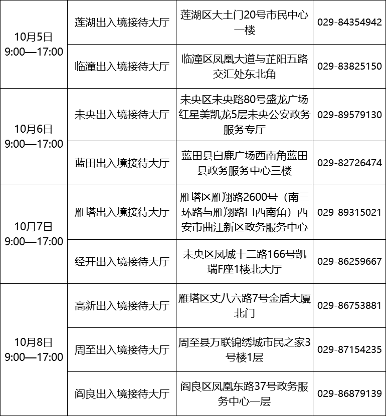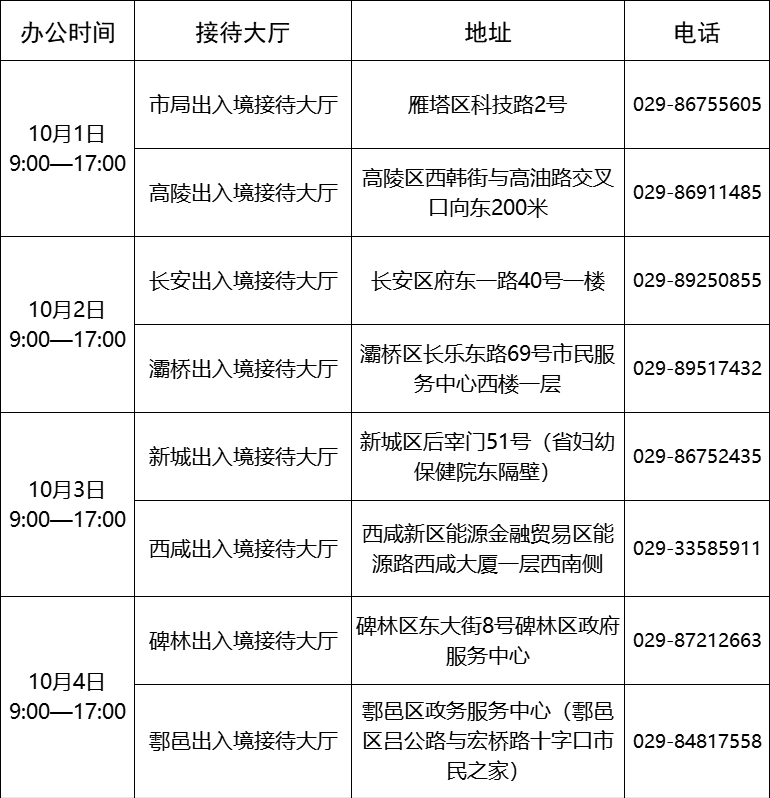 出入境业务办理地址:西咸新区能源路西咸大厦1层出入境业务办理时间:2025年10月3日(周五) 9:00~17:00出入境业务办理电话:029-33585911为满足广大市民国庆假期的出入境办证需求,西安公安出入境将于10月1日至10月8日期间开设便民服务专场,10月9日(星期四)起全市各出入境接待大厅恢复正常对外办公。请您合理选择时间和地点办理出入境证件。