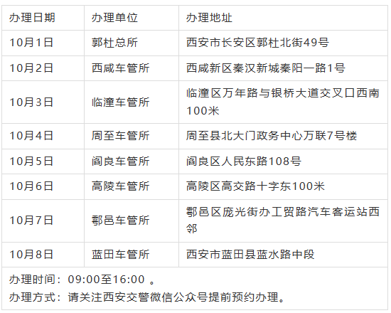 10月1日至10月8日,西安市公安局交通管理支队车辆管理所互联网业务办理中心,正常办理机动车及驾驶证补换领牌证等车驾管业务,市民朋友们可通过“交管12123” APP手机客户端或全国交通安全综合服务管理平台(sn.122.gov.cn)在线办理,相关牌证将通过邮政或顺丰寄递送达。