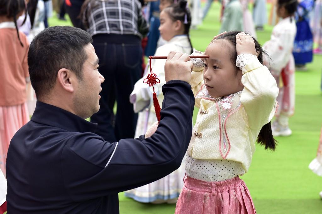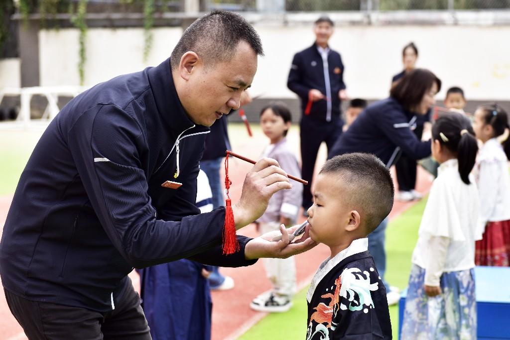 “朱砂启智”环节中,校领导、教师及家长代表为孩子们点上朱砂,寄予他们眼明心亮、勤奋读书的期望。此外,学生们还参与启蒙书写,临摹“人”字,学习做人的道理。