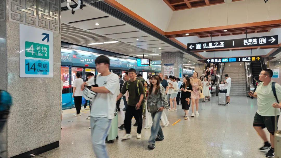 高铁抵达乘客换乘地铁4号线/14号线,可出站后行至北广场地铁出入口进站乘车,或通过连接2号线与4/14号线区域的换乘连廊进行换乘。