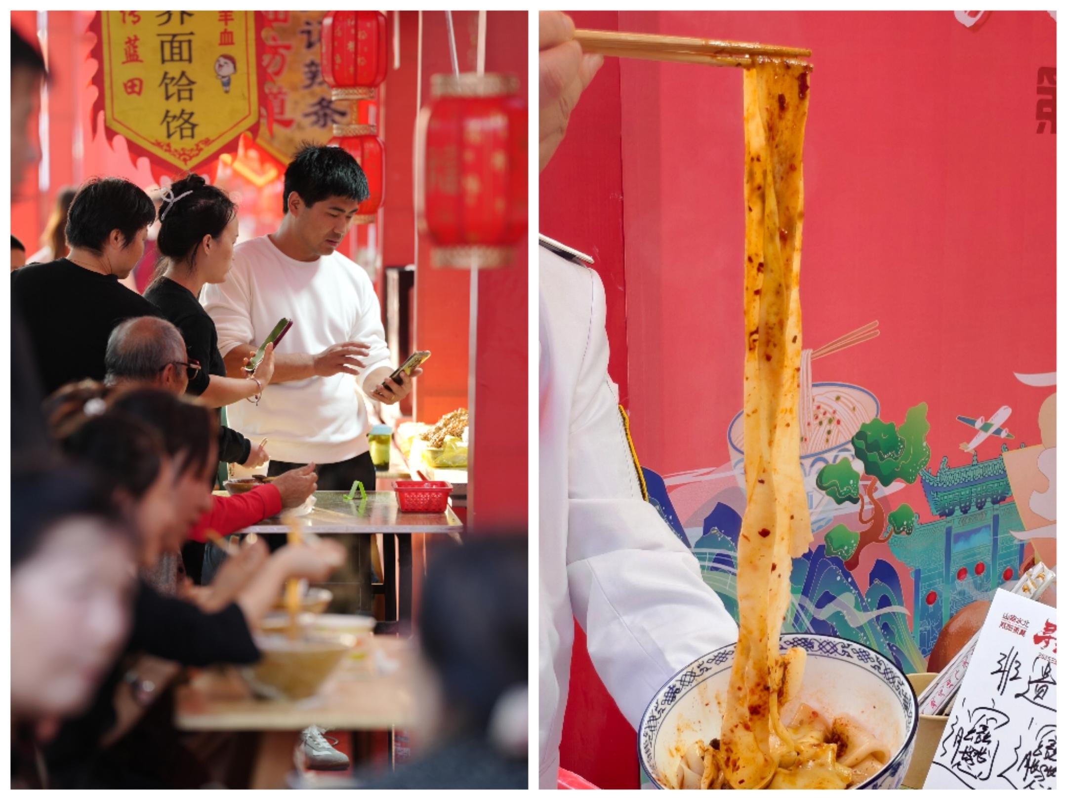 开幕式当天,美食市集已率先飘香。沿着滨河文化街,金线油塔、羊血饸饹、三原白封肉、炒凉粉、石子馍等传统小吃香气四溢,吸引了大量游客驻足品尝。本次美食市集设置了四大主题展区:“寻味三原·三原老味长廊”展现地道本土风味;“品味咸阳·咸阳美食荟萃”汇集咸阳各地特色;“潮味集市·渭湖文创非遗市集”融合传统与创新;“知味陕西·西府特色美食”则带来陕西各地的经典味道。百余家商户齐聚,既有传承百年的老字号,也有创意十足的新派小吃,满足不同游客的味蕾需求。