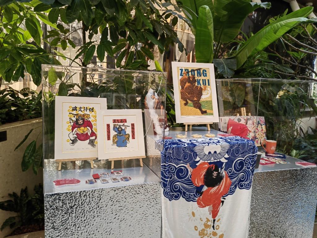 这些作品,皆是师生们“不困于传统,不丢其根本”的实践——正如西安美术学院版画系插画艺术方向第三工作室老师杨璐所言,“技法是服务主题的工具,就像学生曾子怡的《钟馗纳吉》,既保留了钟馗红衣驱邪的经典形象与核心寓意,又用马力板替代传统木板,加入黄蓝绿撞色、英文‘ZHONG KUI’等设计,让传统符号更贴近年轻人审美”。对于作品落地为抱枕、冰箱贴等文创,杨璐表示,这是为了让非遗走出展厅、融入日常,“我们不是和传承人‘PK’文创,而是用高校创意为他们提供新灵感,让钟馗年画的吉祥寓意以‘润物细无声’的方式被感知”。