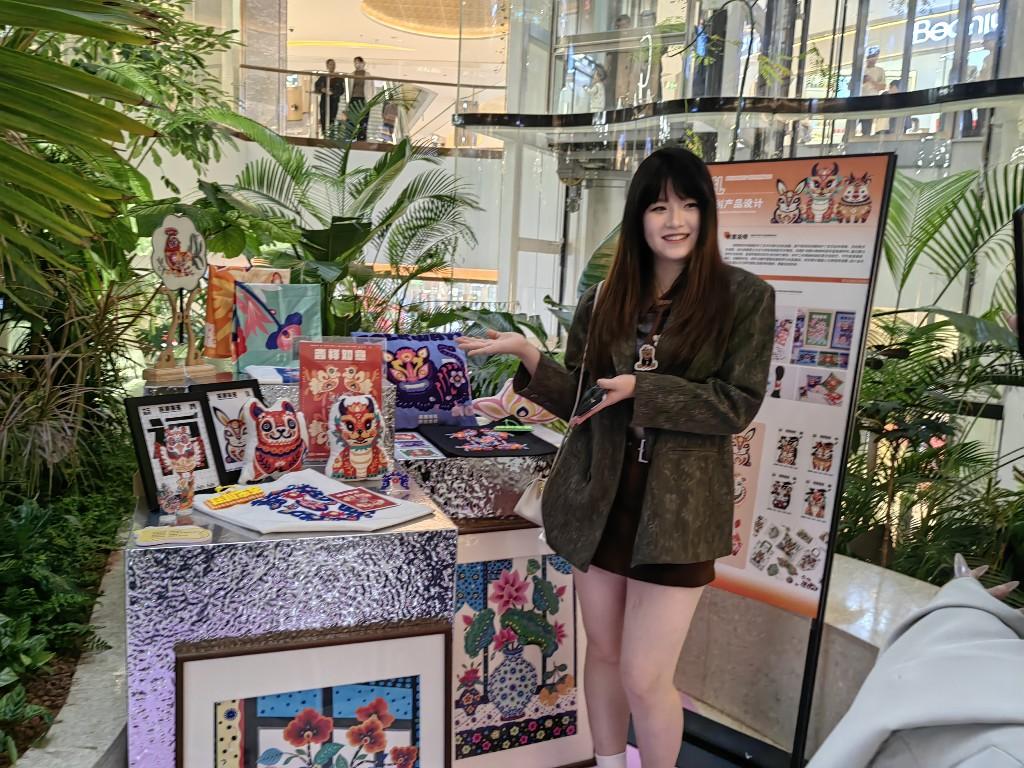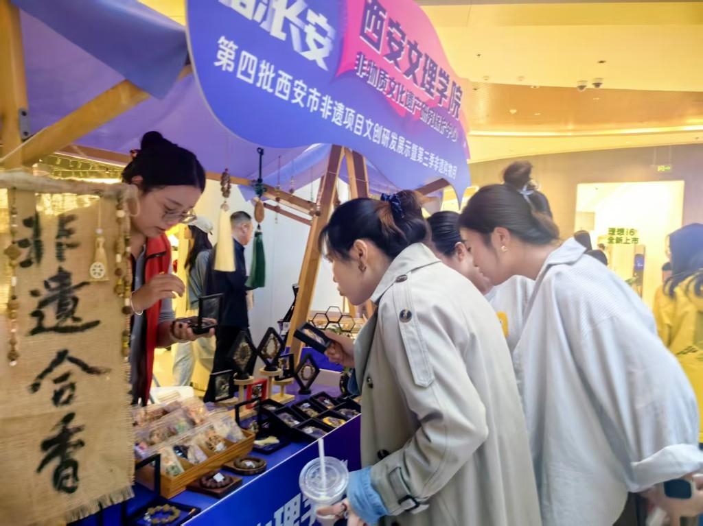 三秦都市报-三秦网讯(记者 夏明勤)绿植葱茏的南飞鸿·乐荟中心一楼长廊,成为一幅传统与现代交织的画卷。9月27日至10月8日,“第四批西安市非遗项目文创研发展示暨第三季非遗购物月”在此举行,以“焕彩华诞,创韵长安”为主题,为市民游客献上一场非遗技艺与创意设计碰撞的秋日文化盛宴。而这场盛宴的核心,正是八所高校师生历时半年打磨的非遗文创作品,它们似散落的珍珠,被创意串联,引得往来市民驻足端详、细细品味。
