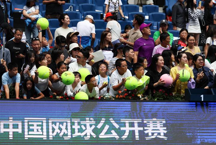2025年10月1日,北京国家网球中心钻石球场举行2025中国网球公开赛男子单打决赛。这是观众在赛后等待选手签名。新华社记者 杜昕怡 摄