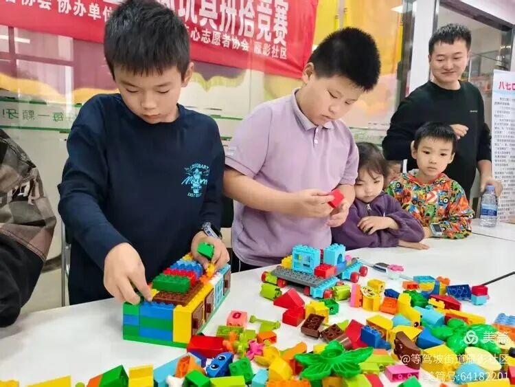 接下来的60分钟,成了活动室里最热闹的“创作时间”。有的孩子蹲在桌前,专注地将蓝色积木拼成“河流”,有的踮着脚把黄色积木堆成“太阳”,志愿者像“魔法助手”般穿梭其间,帮小不点递积木,给有想法的孩子搭把手。