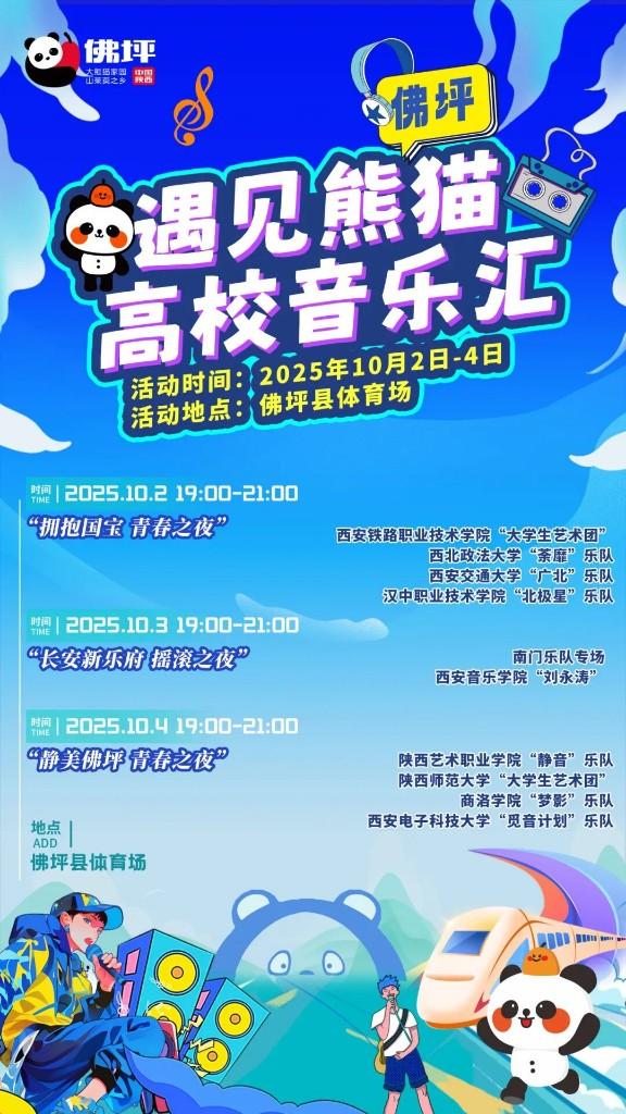 三秦都市报-三秦网讯(记者 夏明勤)这个国庆假期,如果你渴望避开人山人海的热门景点,那么秦岭深处的静美小城佛坪,正为你准备了一场音乐与青春的盛宴——“遇见熊猫”(佛坪)·高校音乐汇将于10月2日至4日在佛坪县体育场连嗨三天,10月2日的“拥抱国宝 青春之夜”“高校乐队专场”将率先登场,集结省内四支优秀大学生乐队用音乐表达青春态度。