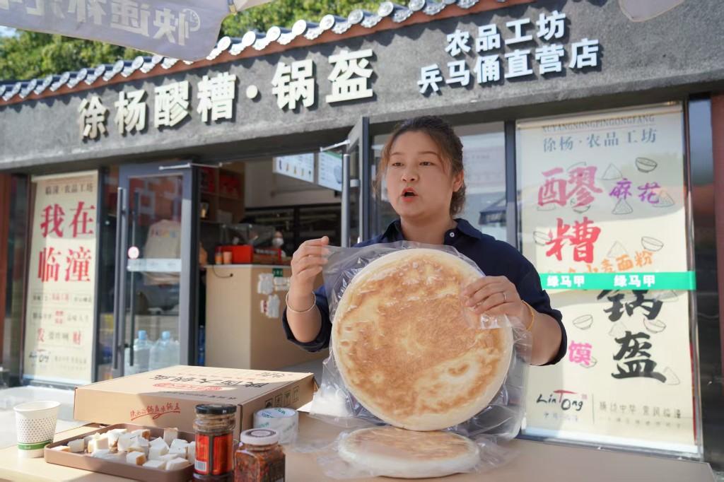 三秦都市报-三秦网讯(王三合 罗文艳 记者 胡琳)“家人们,这是咱们今天的主角——陕西特产大锅盔,它可是陕西面食‘扛把子’,用优质高筋小麦粉,加酵母自然发酵,再经温火慢烤,烤出来的锅盔厚实扎实,麦香特别浓……”9月29日,在西安市临潼区全都more购物中心,徐杨街道电商闫双手持特色农产品,正向消费者细致讲解。
