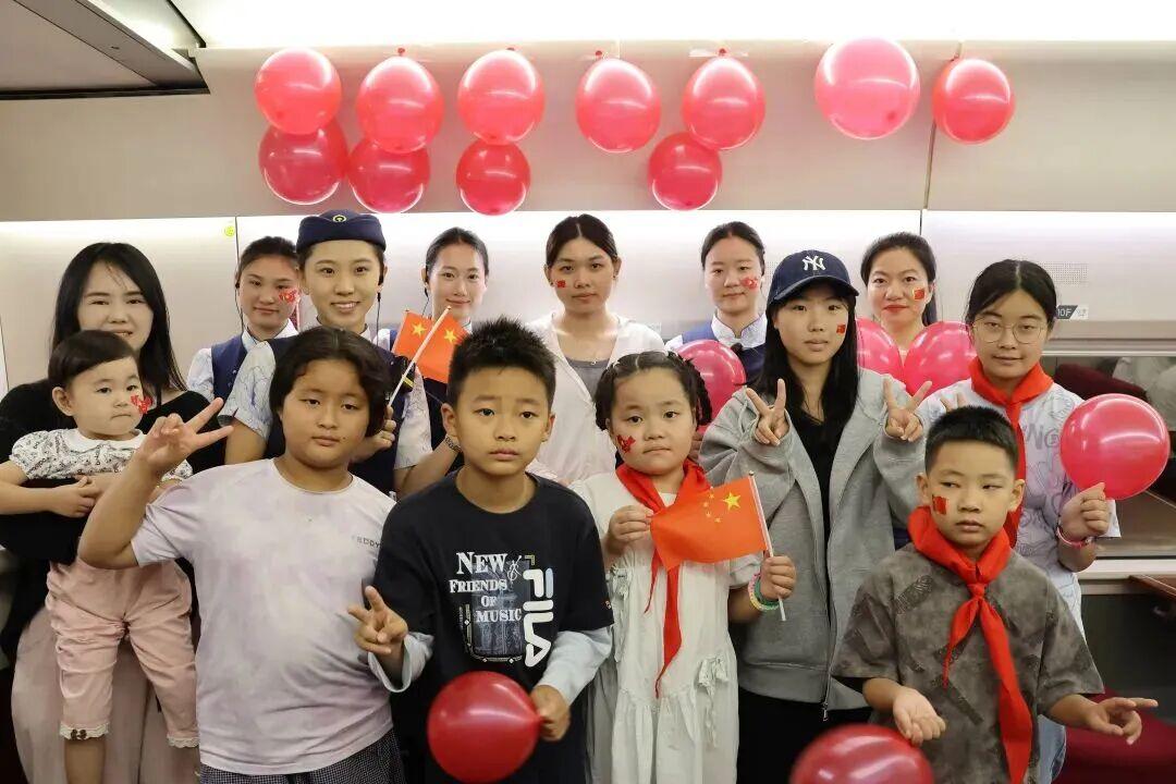 10月1日,福州南开往成都东的列车上,车厢里的儿童一同为祖国庆生。