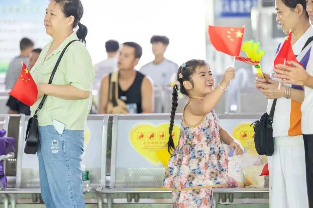 候车厅里,小女孩挥舞着国旗,十分可爱。