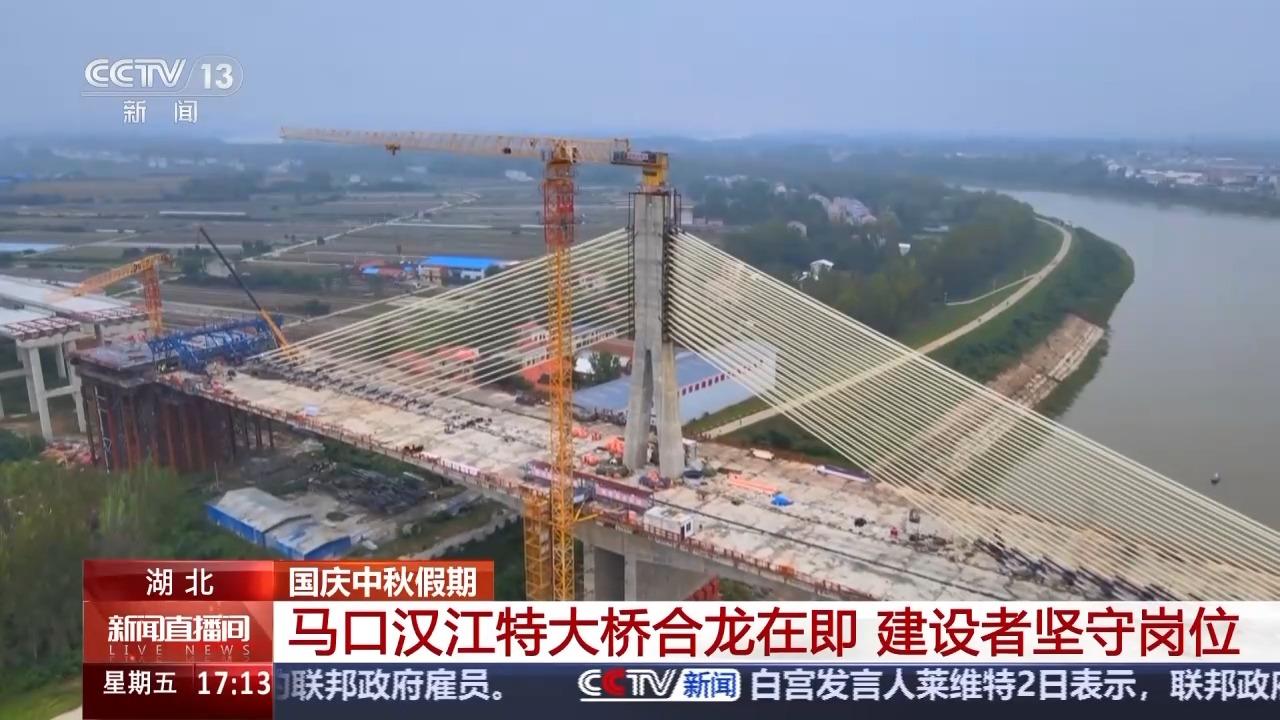 在湖北汉川,武天高速马口汉江特大桥已展露雄姿,预计11月合龙,全桥贯通。这个国庆假期,200多名建设者正奋战在施工一线,全力保障项目建设进度。