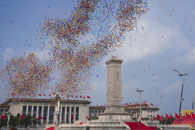 2025年9月3日,纪念中国人民抗日战争暨世界反法西斯战争胜利80周年大会在北京隆重举行。这是纪念大会现场放飞气球和鸽子。(图片来源:新华社)