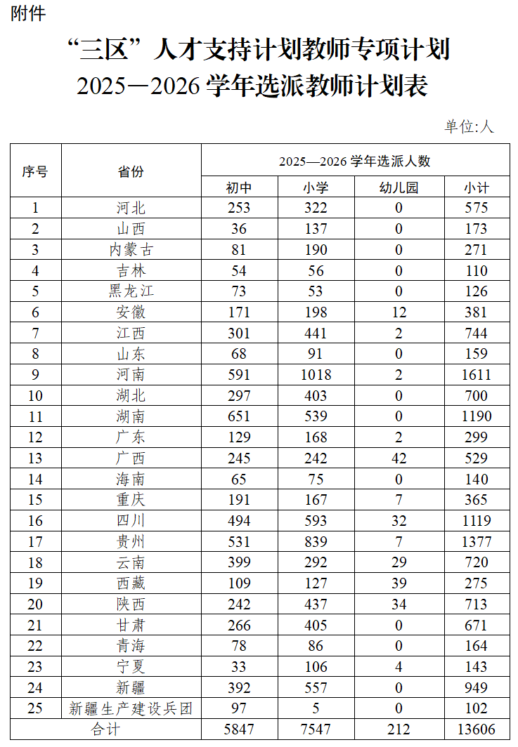 《通知》指出,2025—2026学年全国计划选派13606名教师,其中初中计划选派5847名,小学计划选派7547名,幼儿园计划选派212名。选派教师主要由各省(区、市)和新疆生产建设兵团在本行政区域范围内调配,调动省会城市、中心城市、非受援县的优质教师资源支持省内受援县。实施范围继续聚焦脱贫地区(原国家确定的连片特困地区、国家扶贫开发工作重点县、省级扶贫开发工作重点县及各地确定的其他深度贫困地区、新疆生产建设兵团困难团场),重点向国家乡村振兴重点帮扶县、“三区三州”等地区倾斜。