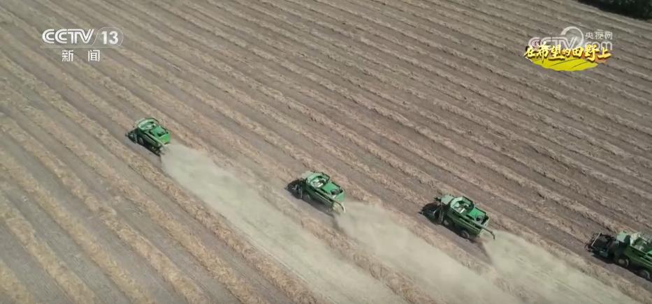 在内蒙古呼伦贝尔,1300万亩大豆进入收获期,一台台大型农机设备抓住最佳收获时机高效作业。