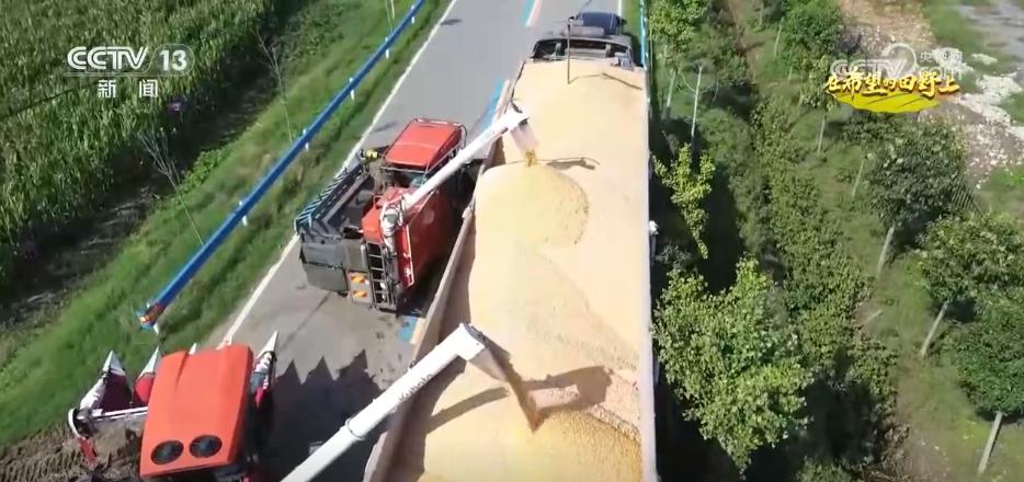 在南阳社旗县大冯营镇张腰庄村的一处玉米地,收割机正穿梭忙碌,履带碾过湿润的田垄,玉米棒被快速收割、脱粒,顺着传送带落入车斗,空气中弥漫着清甜的玉米香。而在大冯营镇韩营村,3台履带式收割机一字排开,饱满的玉米粒通过输送筒源源不断地“流”入等候的运输车内。