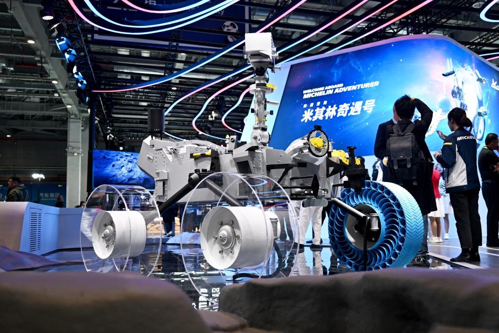 这是2024年11月6日在第七届进博会汽车展区拍摄的在亚洲首次亮相的米其林月球探测车轮胎。新华社发(陈浩明摄)