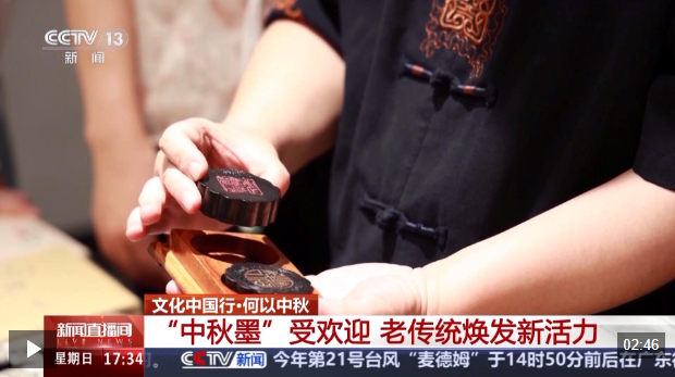 眼下,在安徽黄山的老街上,为今年中秋节定制的两款“中秋墨”深受游客们的欢迎。制墨师傅将传统徽墨创新为月饼造型。“中秋团圆”“花好月圆”的描金字样彰显非遗质感,缠枝纹、回纹承载着吉祥寓意,展现了传统文化的韵味。