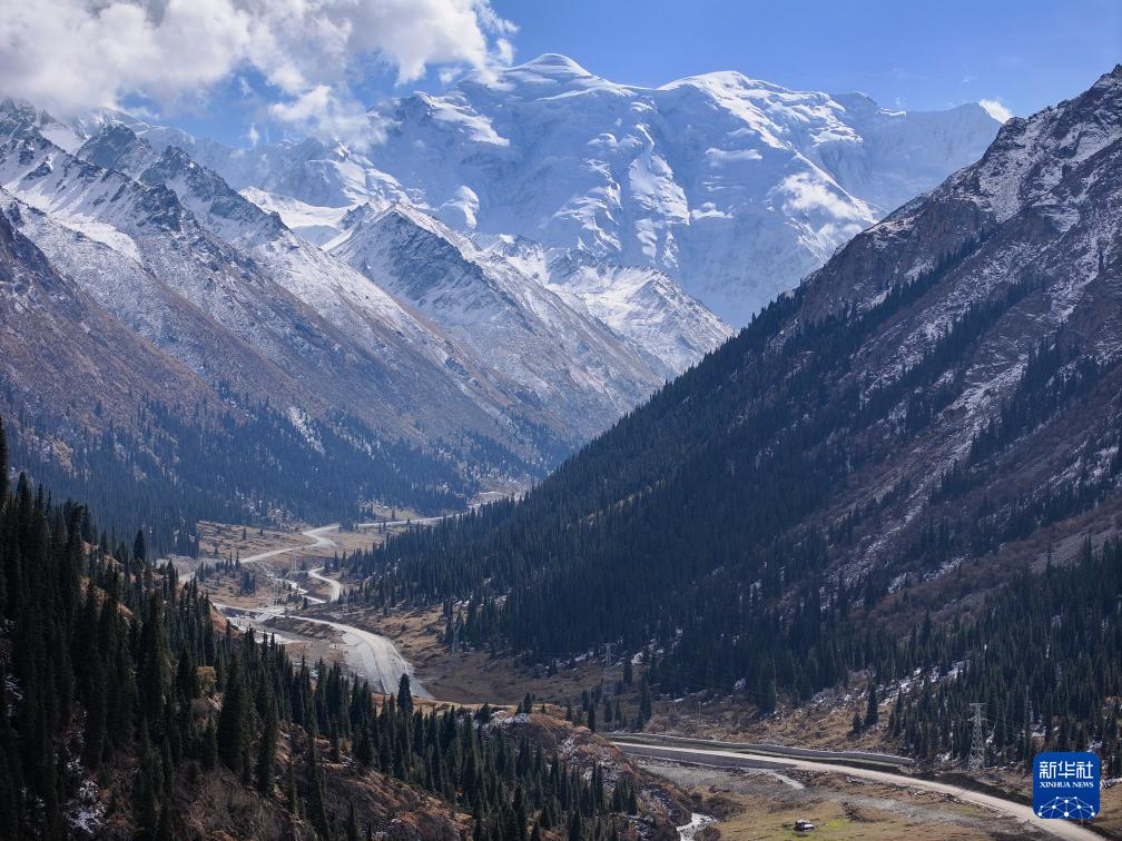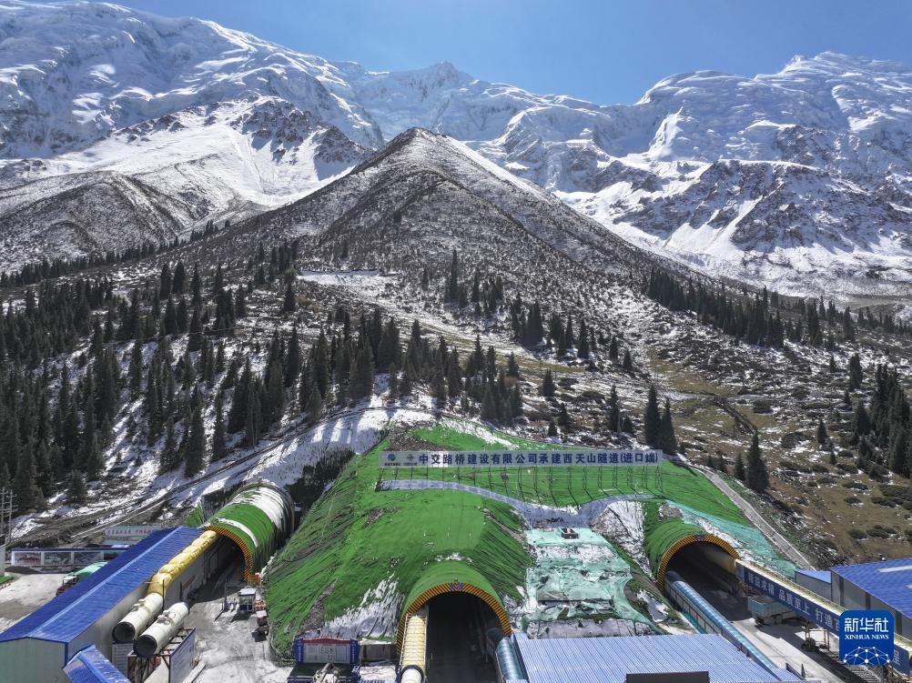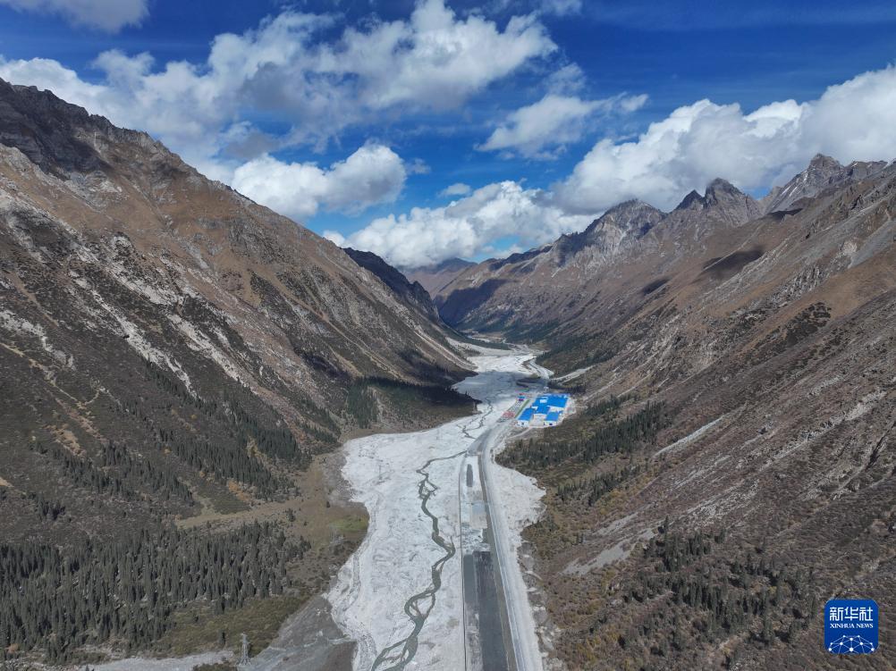 这是10月5日在新疆昭苏县拍摄的昭温公路西天山特长隧道进口端及附近施工现场(无人机照片)。该隧道为全线关键控制性工程,全长15.707千米,由北向南穿越天山山脉。