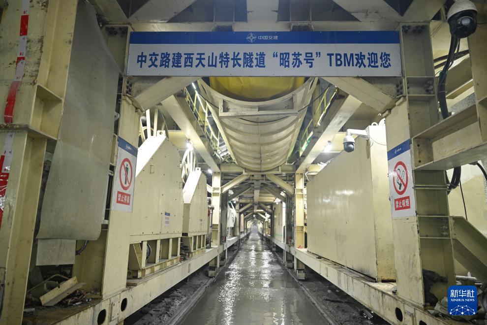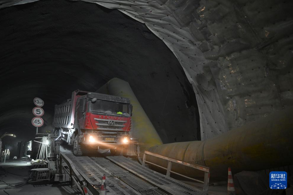施工车辆行驶在昭温公路西天山特长隧道右洞内(10月5日摄)。