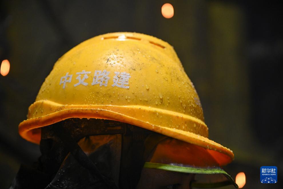 隧道内的渗水淋到工人的安全帽上(10月5日摄)。