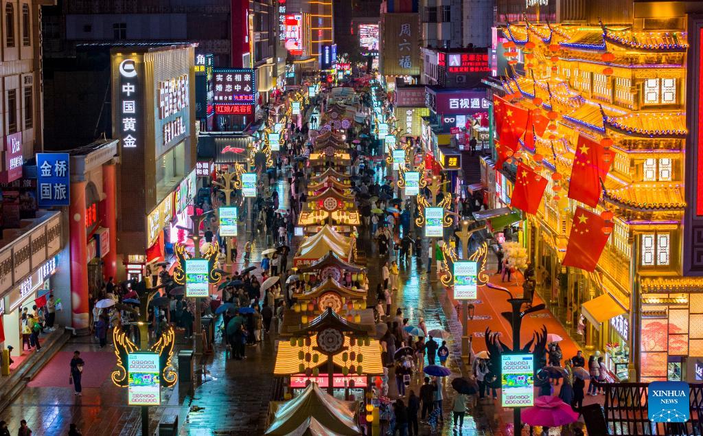 An aerial drone photo taken on Oct. 5, 2025 shows people visiting the Drum Tower pedestrian street in Yinchuan, capital city of northwest China's Ningxia Hui Autonomous Region. Tourist destinations across China are witnessing a surge in visitors as the country's eight-day National Day and Mid-Autumn Festival holiday began on Wednesday. (Xinhua/Yang Zhisen)