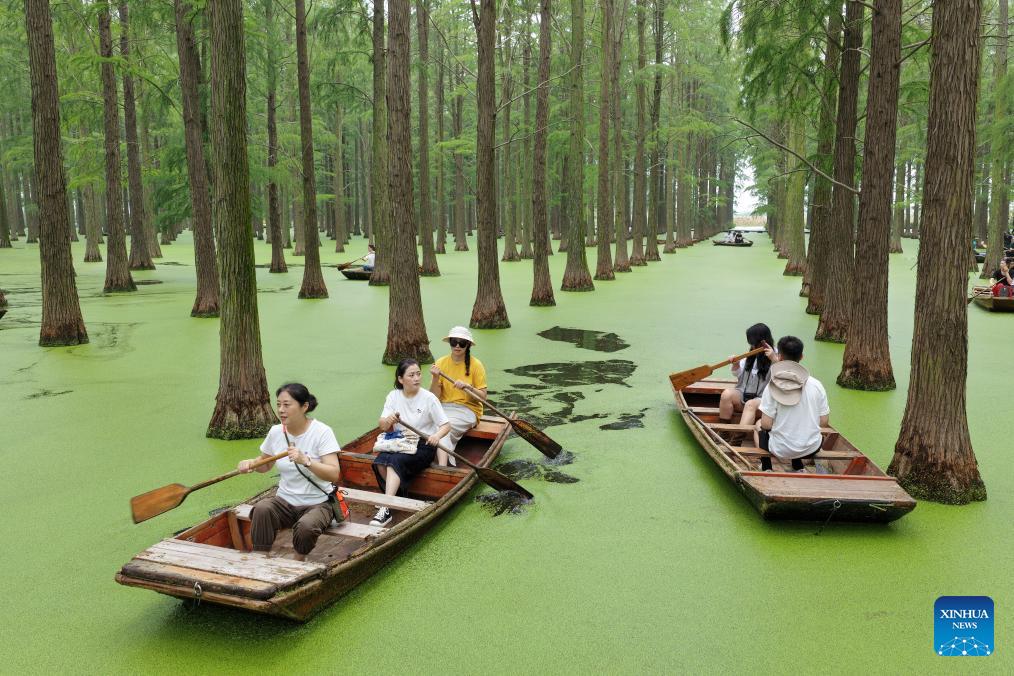 An aerial drone photo taken on Oct. 5, 2025 shows tourists rowing boats at Luyang Lake wetland park in Yangzhou, east China's Jiangsu Province. Tourist destinations across China are witnessing a surge in visitors as the country's eight-day National Day and Mid-Autumn Festival holiday began on Wednesday.