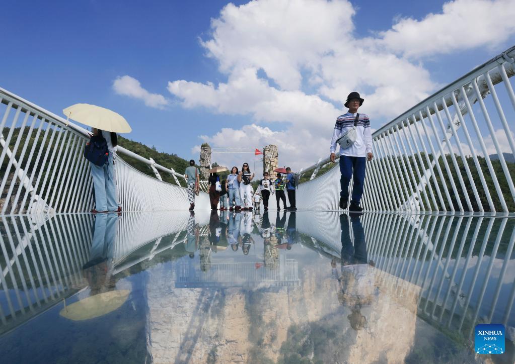 Tourists visit a glass-bottomed bridge at Zhangjiajie Grand Canyon in central China's Hunan Province, Oct. 5, 2025. Tourist destinations across China are witnessing a surge in visitors as the country's eight-day National Day and Mid-Autumn Festival holiday began on Wednesday. (Photo by Wu Yongbing/Xinhua)