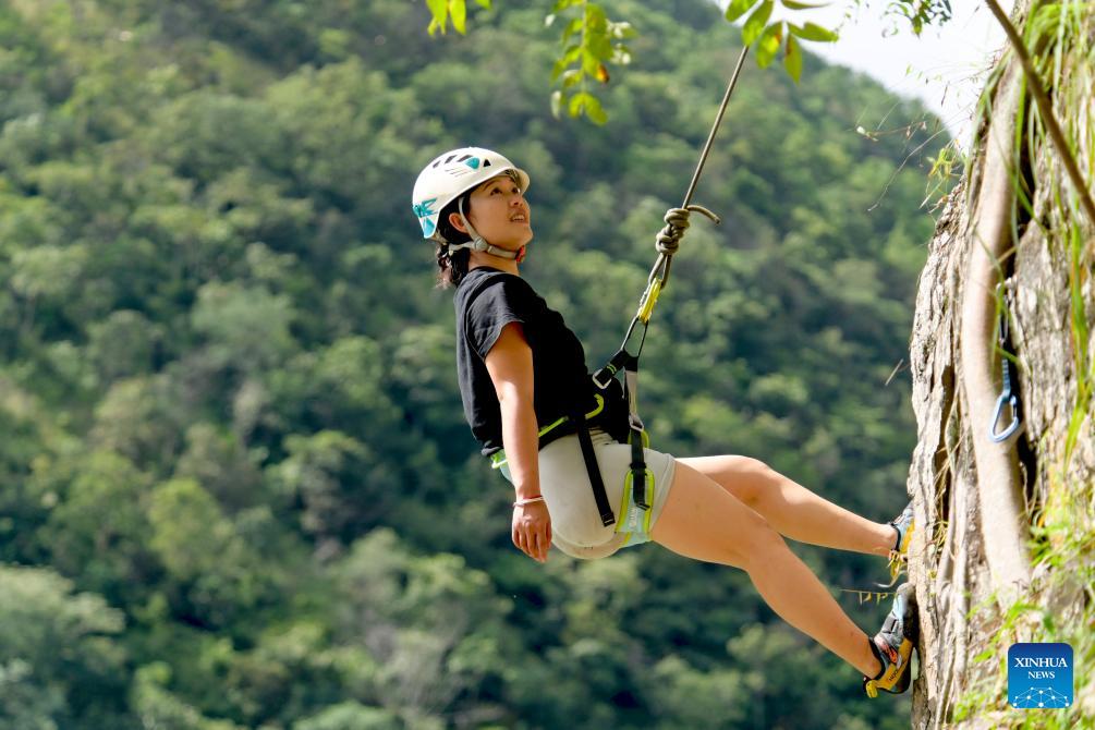 A tourist tries cliff climbing in Gonglang Town in Nanjian Yi Autonomous County, southwest China's Yunnan Province, Oct. 4, 2025. Tourist destinations across China are witnessing a surge in visitors as the country's eight-day National Day and Mid-Autumn Festival holiday began on Wednesday. (Photo by Shi Zhihong/Xinhua)