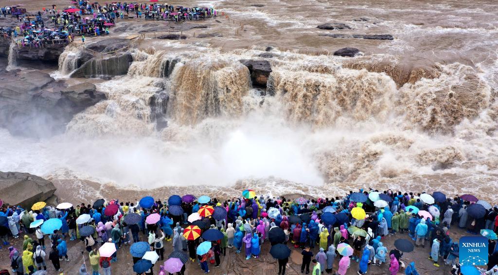 An aerial photo taken on Oct. 5, 2025 shows people visiting the Hukou Waterfall on the Yellow River in Jixian County, north China's Shanxi Province. Tourist destinations across China are witnessing a surge in visitors as the country's eight-day National Day and Mid-Autumn Festival holiday began on Wednesday. (Photo by Lyu Guiming/Xinhua)
