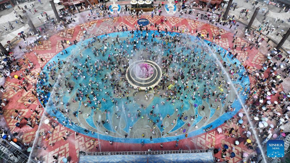 An aerial drone photo taken on Oct. 5, 2025 shows tourists attending a water-splashing event at a scenic spot in Jinghong City, southwest China's Yunnan Province. Tourist destinations across China are witnessing a surge in visitors as the country's eight-day National Day and Mid-Autumn Festival holiday began on Wednesday. (Photo by Li Yunsheng/Xinhua)