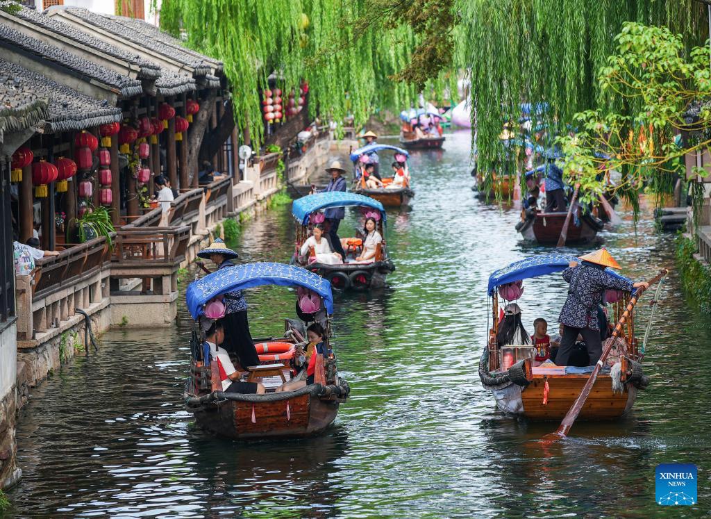 This photo taken on Oct. 5, 2025 shows tourist boats sailing on a canal in the ancient town of Zhouzhuang in Kunshan, east China's Jiangsu Province. Tourist destinations across China are witnessing a surge in visitors as the country's eight-day National Day and Mid-Autumn Festival holiday began on Wednesday. (Photo by Zhou Shegen/Xinhua)